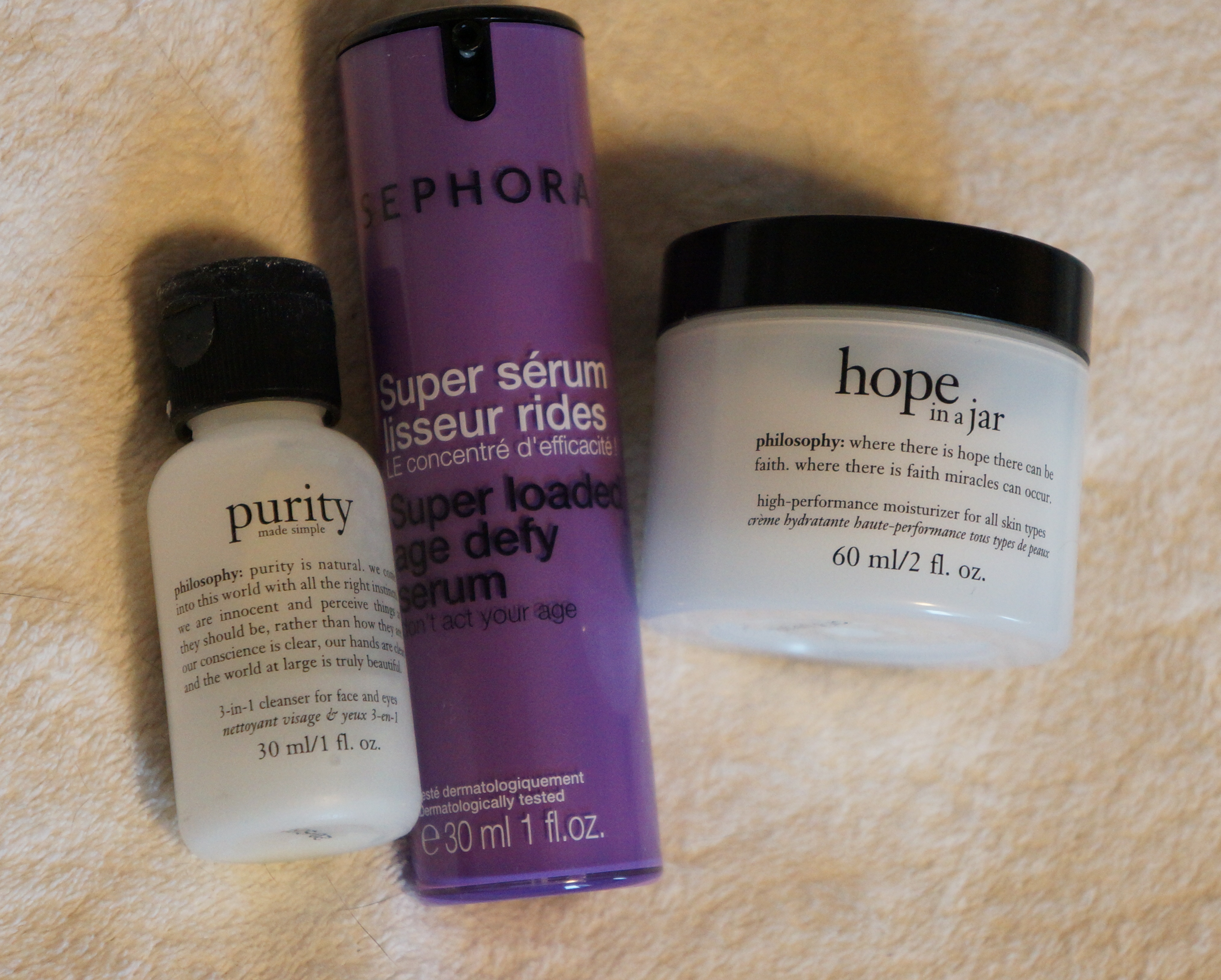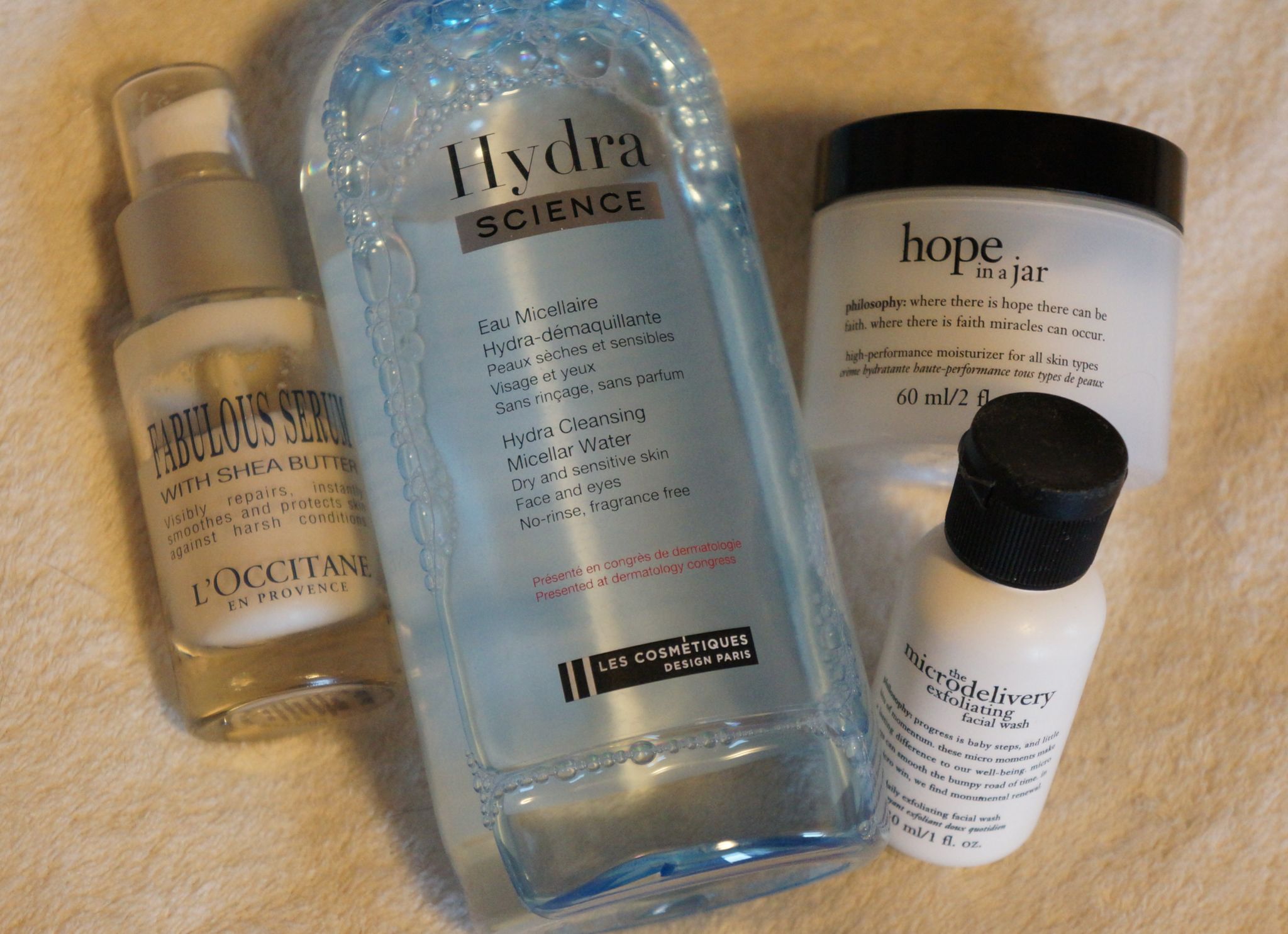 – Crème de jour « Hope in a Jar » de Philosophy: Crème de jour légère. On dirait presque qu’elle est fouettée. En été, seule, elle est parfaite. Ici, en complément avec le sérum de L’Occitane, c’est une bonne combinaison. Aussi étrange que ça puisse vous paraître, même si j’ai une peau déshydratée et sensible, une crème trop riche me donne des boutons. Ici, j’ai donc su trouver un bon équilibre pour chouchouter ma peau sans l’obstruer. Puisqu’elle est légère, elle pénètre très facilement, ce qui, le matin, est un gain de temps non négligeable…