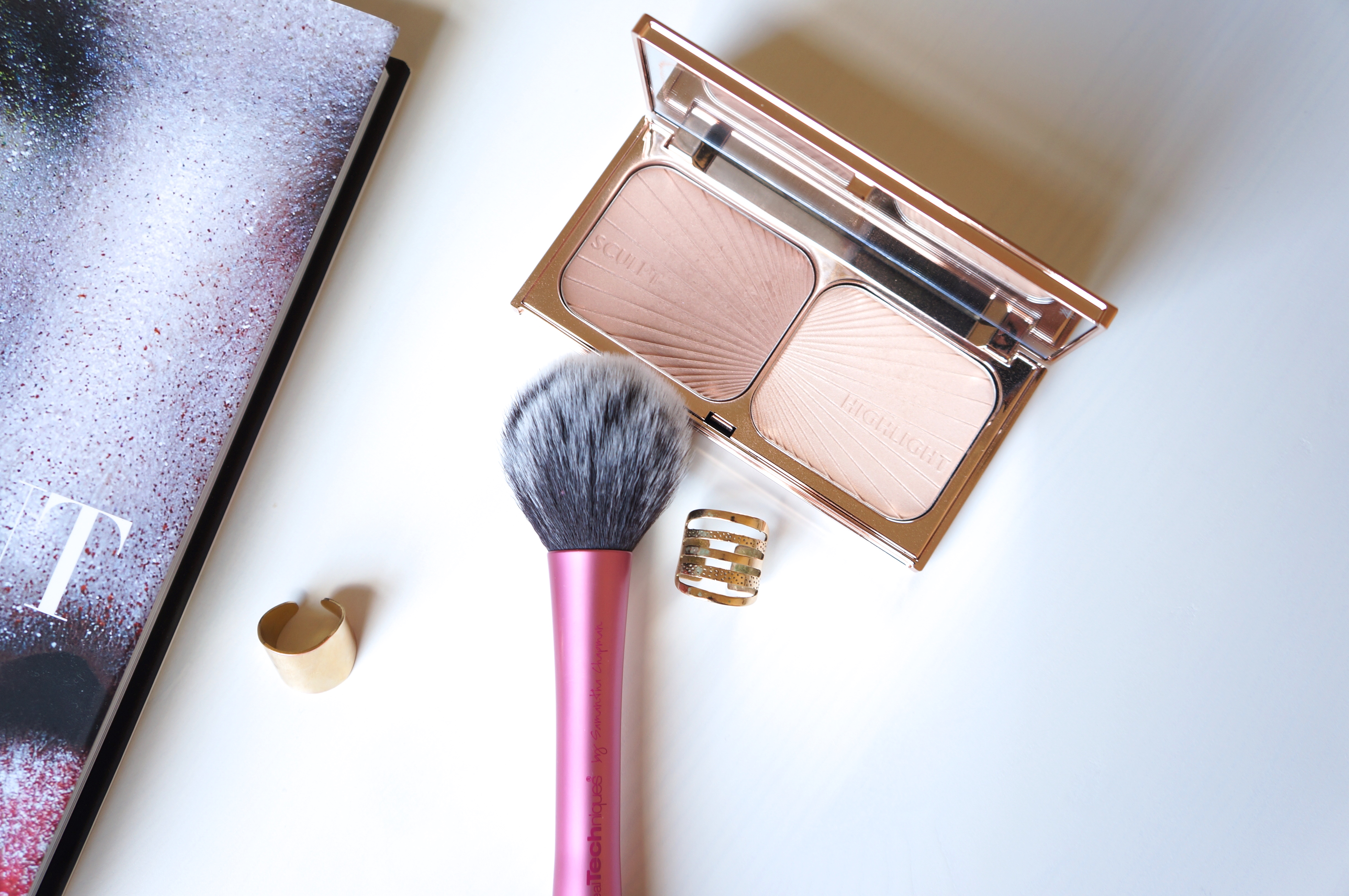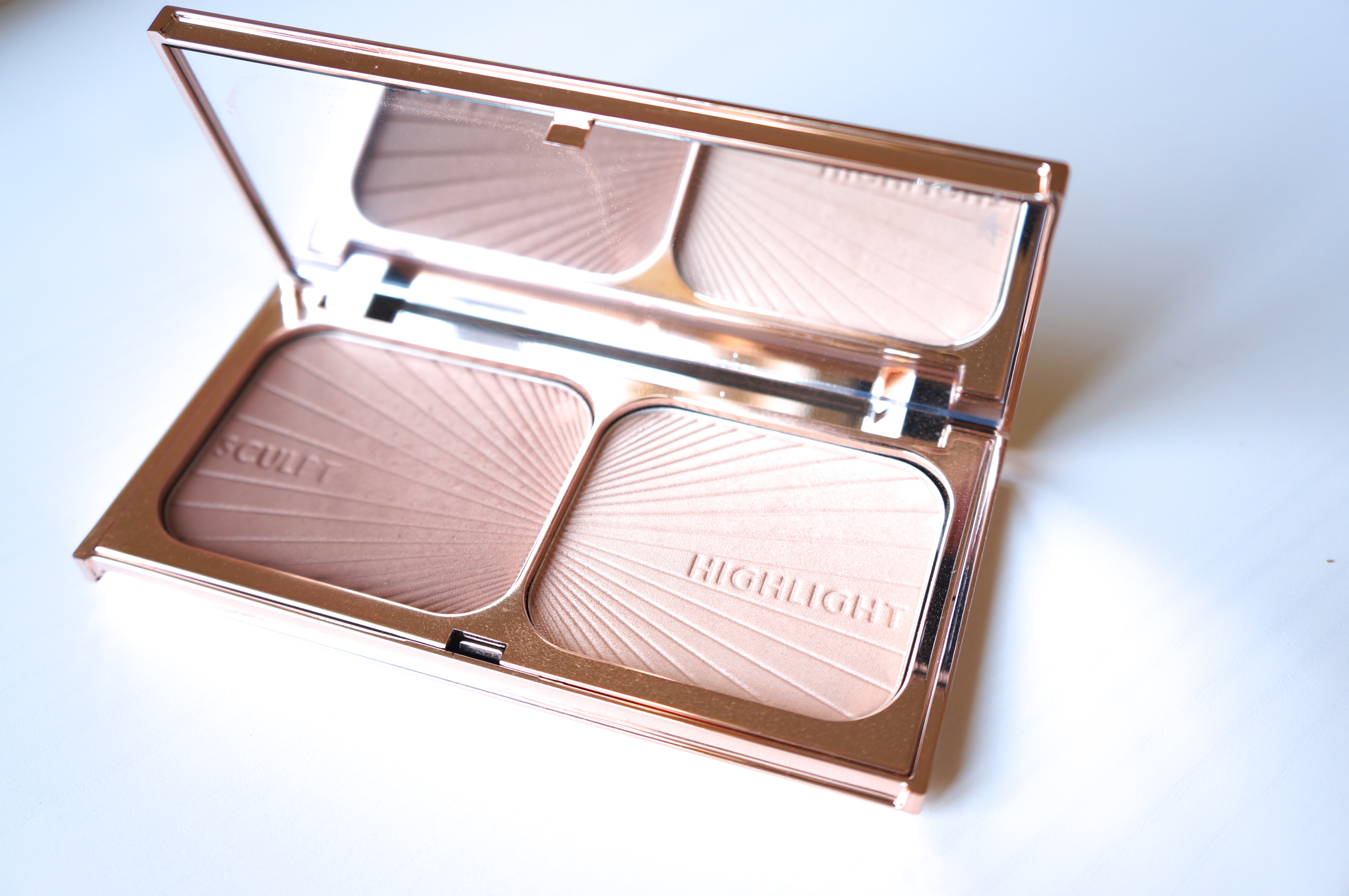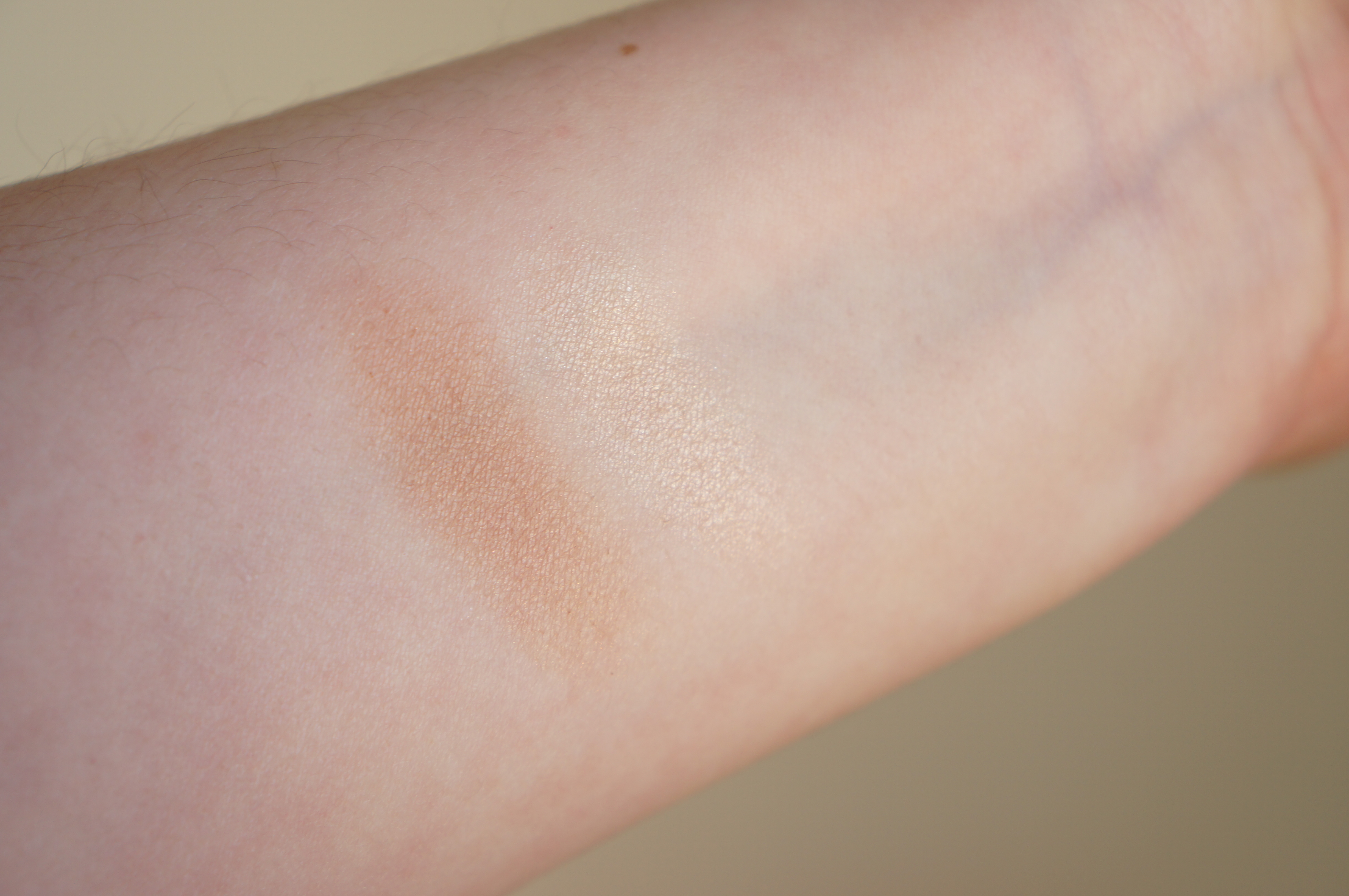 Quant au highlighter, je m’attendais au bazar supra brillant que je n’allais pouvoir mettre que le soir. Ici, les avis sont assez mitigés autour de moi. Certaines disent qu’il est tout sauf subtil, d’autres diront qu’il est finalement assez discret. Histoire de vous donner un point de repère (pour les connaisseuses): il est beaucoup plus discret que le Sleek ou les Becca mais n’est pas non plus totalement invisible. En ce qui me concerne, c’est aussi un véritable coup de coeur. Une jolie teinte légèrement dorée (beaucoup moins que le Soft & Gentle cela dit) qui illumine bien mais en douceur. La ligne de lumière que vous voyez sur mon nez, c’est lui d’ailleurs. De plus, il ne marque pas trop les défauts de la peau ou les pores (en tous cas, chez moi).