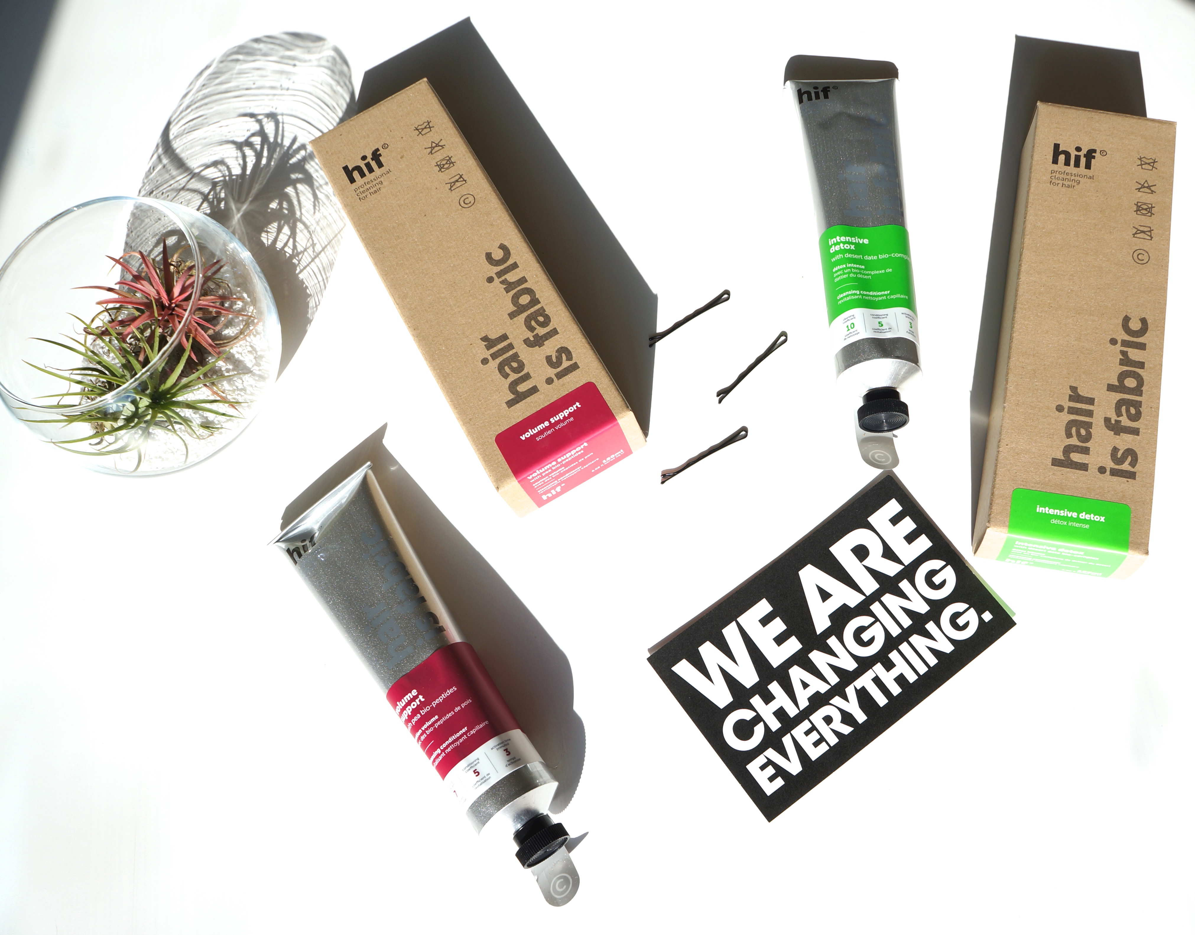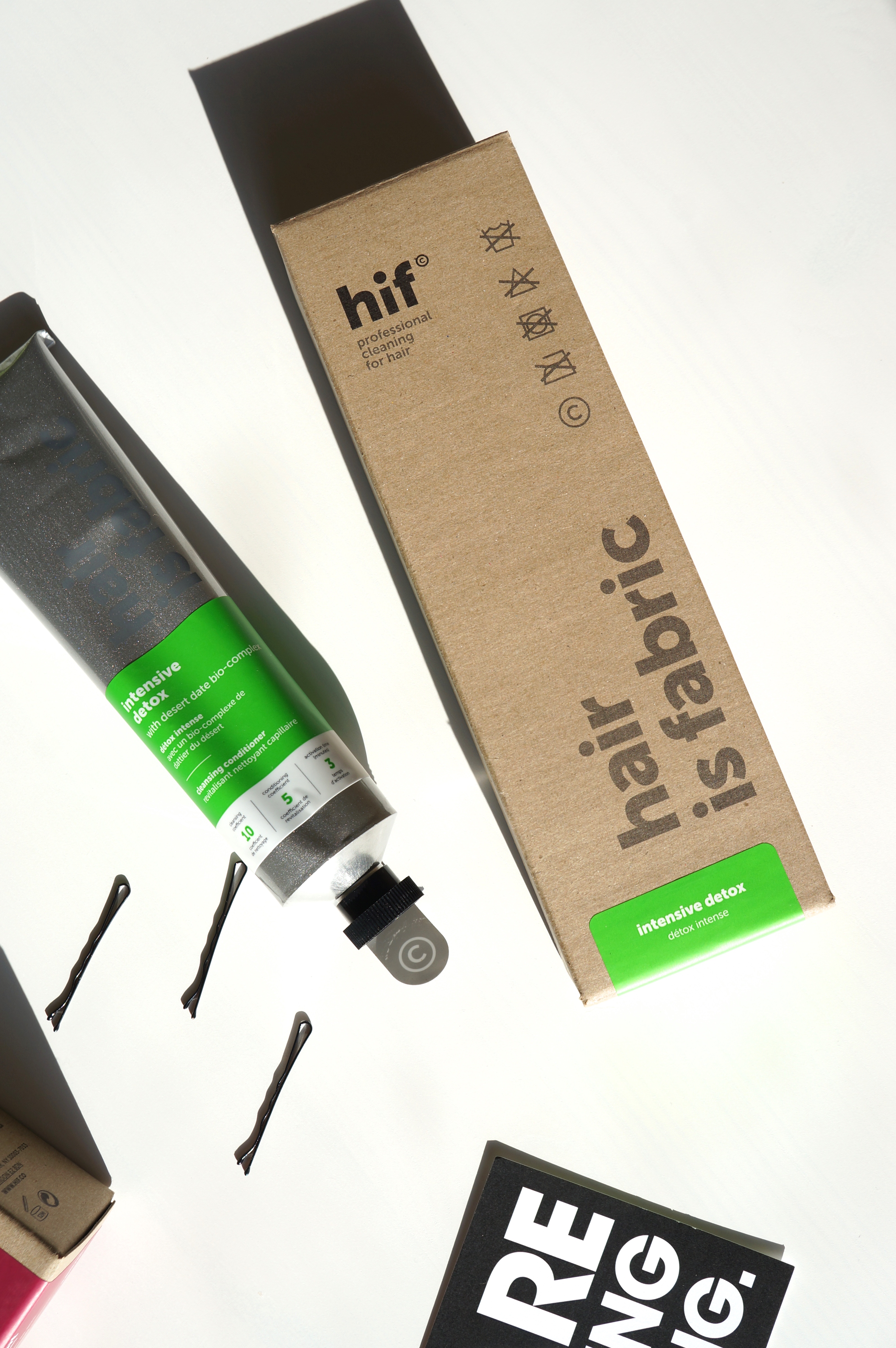 HIF est en fait un concept de shampoings qui propose de laver ses cheveux à sec (mais avec de l’eau). Ils amènent l’idée que l’on devrait traiter ses cheveux comme des vêtements haute couture qu’on apporterait au pressing. Exit donc tous les tensioactifs habituels! On a ici une crème épaisse dont la composition tire plus sur l’après-shampoing que le shampoing. Bien que pas bio pour un balle, on est clairement dans une tendance low poo qui consiste donc à ne pas se laver les cheveux mais plutôt à les soigner. Le design du packaging est d’ailleurs très ciblé: des tubes de peintures avec les symboles de nettoyage que l’on trouve sur les vêtements. La marque se veut décidément originale, pas de doute là-dessus. Question originalité, on la retrouvera donc surtout dans son utilisation et son approche. Vu la nature de mes cheveux fins re-graissant vite et d’un plat ennuyeux, j’ai donc pu tester le Volume Support et l’Intensive Detox.