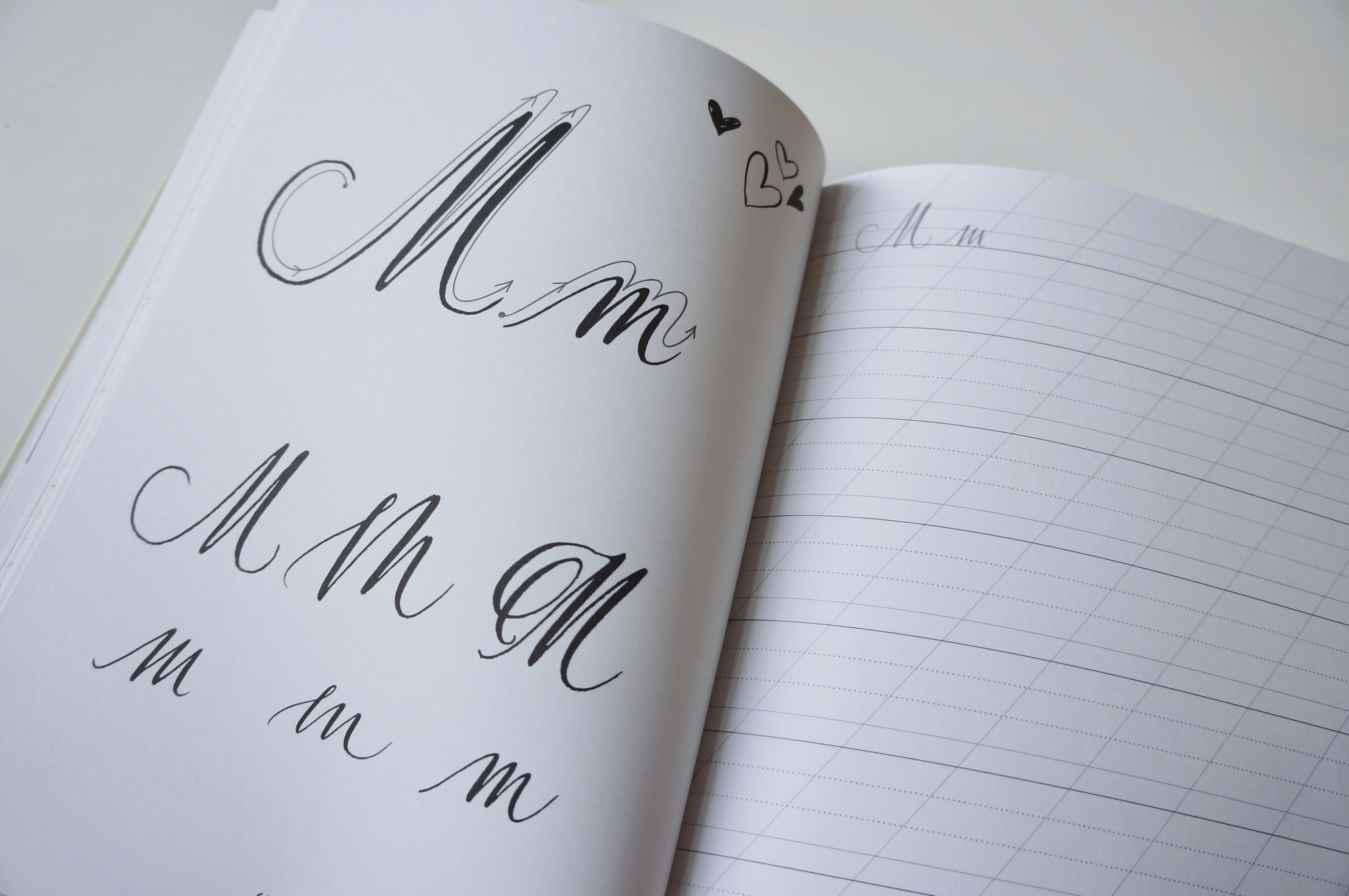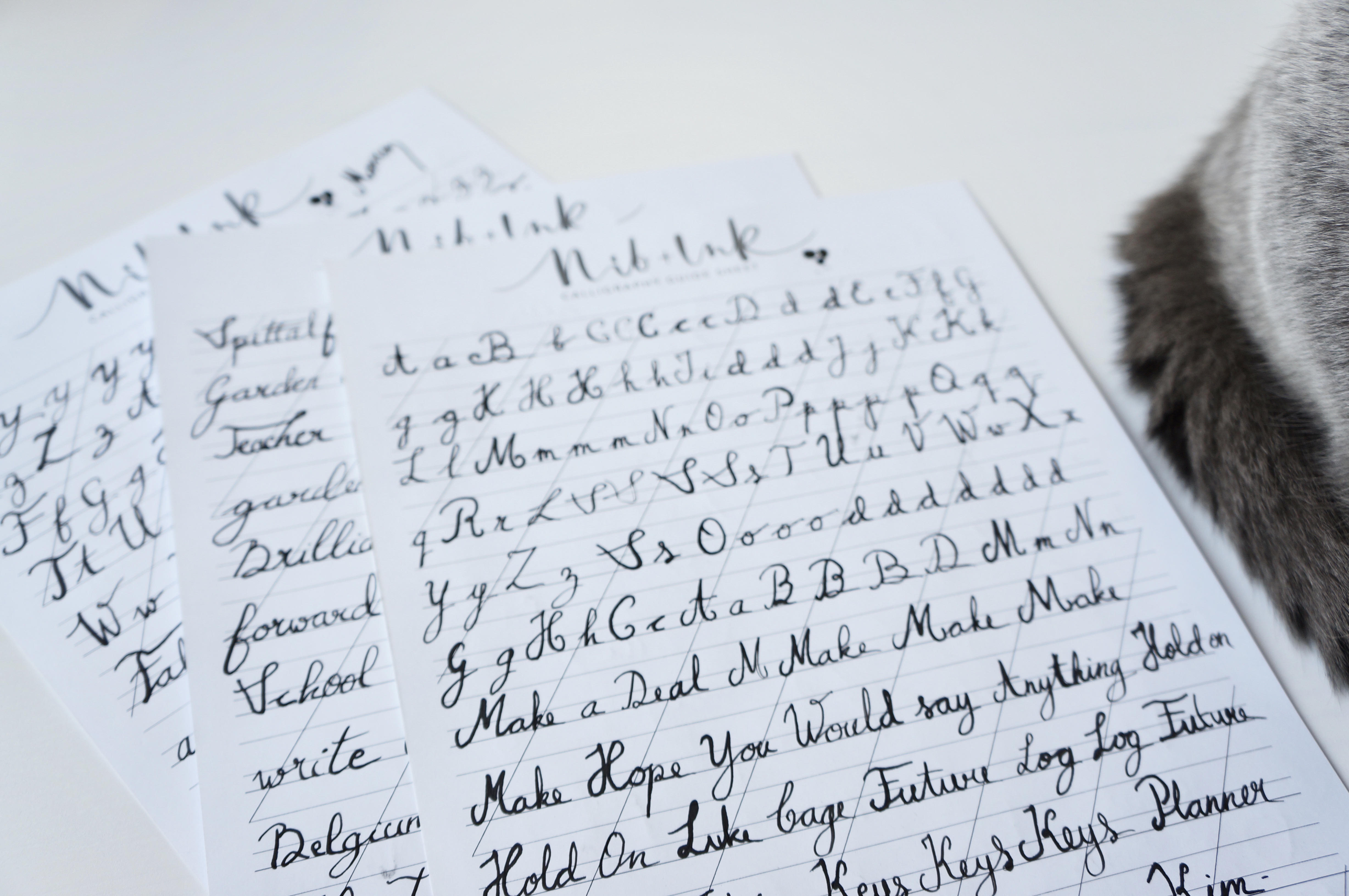 Avec « Nib & Ink », je me suis donc entraînée aux bases: savoir faire mes lignes ascendantes fines et descendantes épaisses, connecter les lignes, les lettres, etc. Le livre propose des pages d’entraînement à télécharger sur le net que j’ai pu faire photocopier sur du papier adéquat chez L’Ami Couleur (ils sont magiques là-bas!). Et le reste est simple: beaucoup d’entraînement, de patience, de concentration, de calme (et un chat). Ca a l’air fastidieux comme ça mais en fait, je faisais 3 pages de lettres ou de mots et il était déjà passé 2-3h alors que j’avais eu l’impression de commencer il y a 10 minutes.