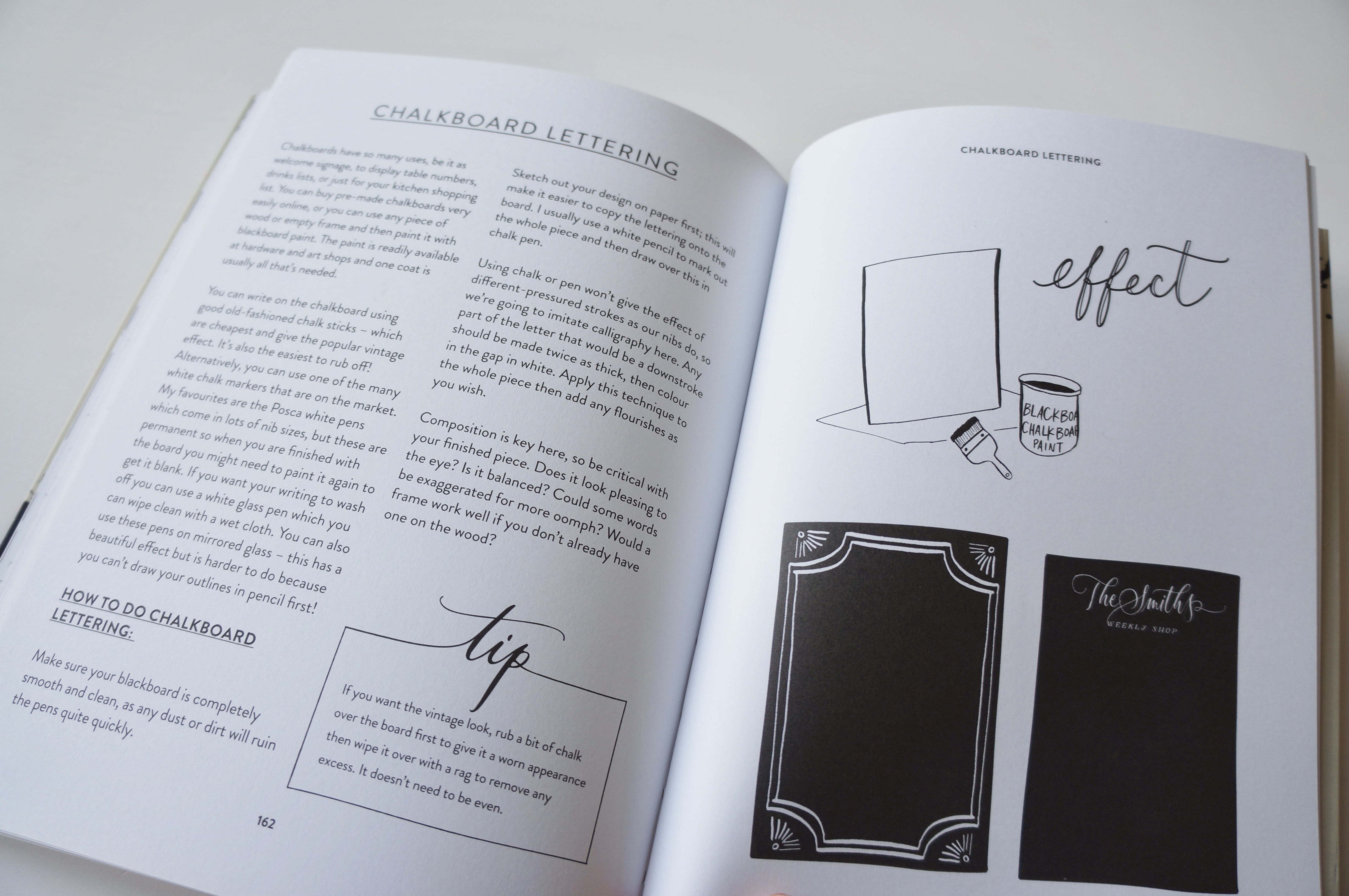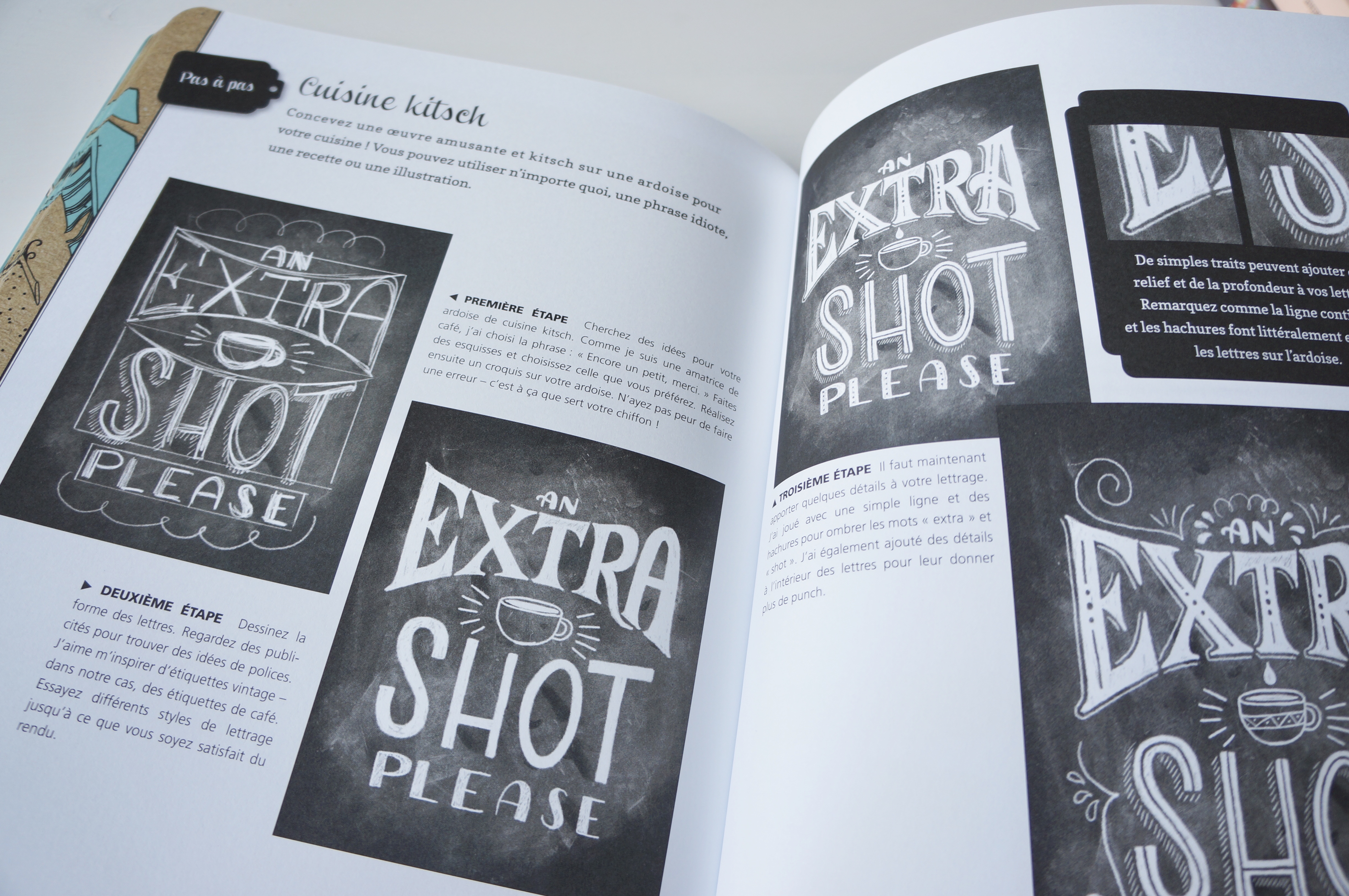 Ici on s’amuse dans les bannières, on apprend comment écrire sur verre, sur de la vaisselle, on voit comment optimiser le lettrage sur tableau noir, etc. Le tout, forcément avec du matériel très différent. Franchement, si vous êtes un petit indépendant avec peu de moyens mais qui n’hésite pas à se décarcasser pour améliorer son commerce, ce genre de petits panneaux, ça peut vous attirer le chaland sans trop d’effort. C’est chaleureux et les touches personnelles sont toujours appréciées. Une fois le bidule maîtrisé, ça ne demande pas trop de temps. Le livre va même jusqu’à vous proposer comment enluminer des lettres (oui oui, comme les moines dans les films du Moyen-Age, ceux qui cherchent la calvitie avant même de l’avoir).