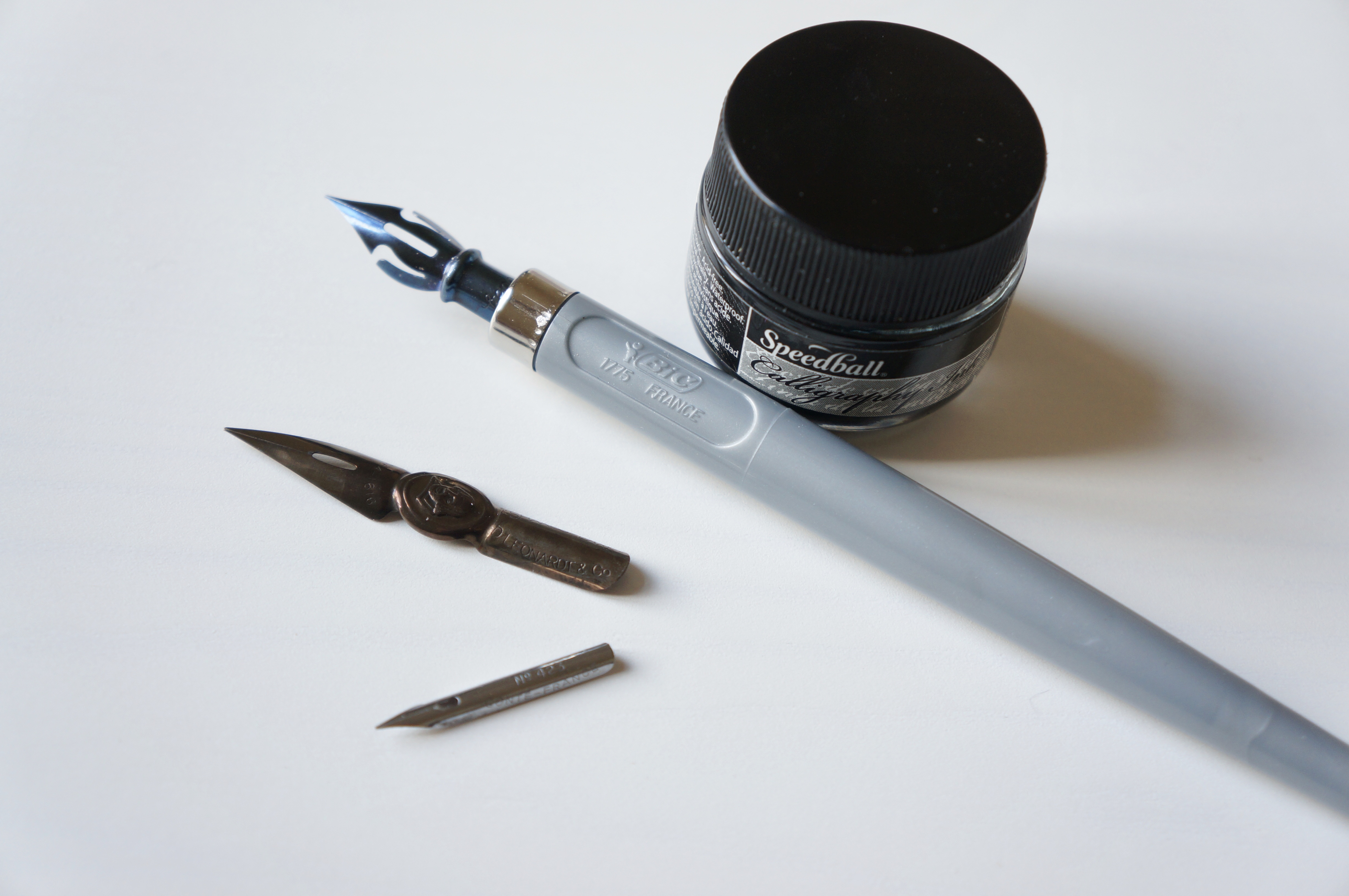 Au niveau du matos, j’ai commencé avec la plume Shakespeare (celle du milieu) puis j’ai bifurqué sur la plume Batman (la bleue) que j’adore et j’ai acheté une toute petite au cas où j’ai besoin de faire des petites enveloppes par exemple. Pour l’encre, une simple encre noire de Chine m’a suffit.