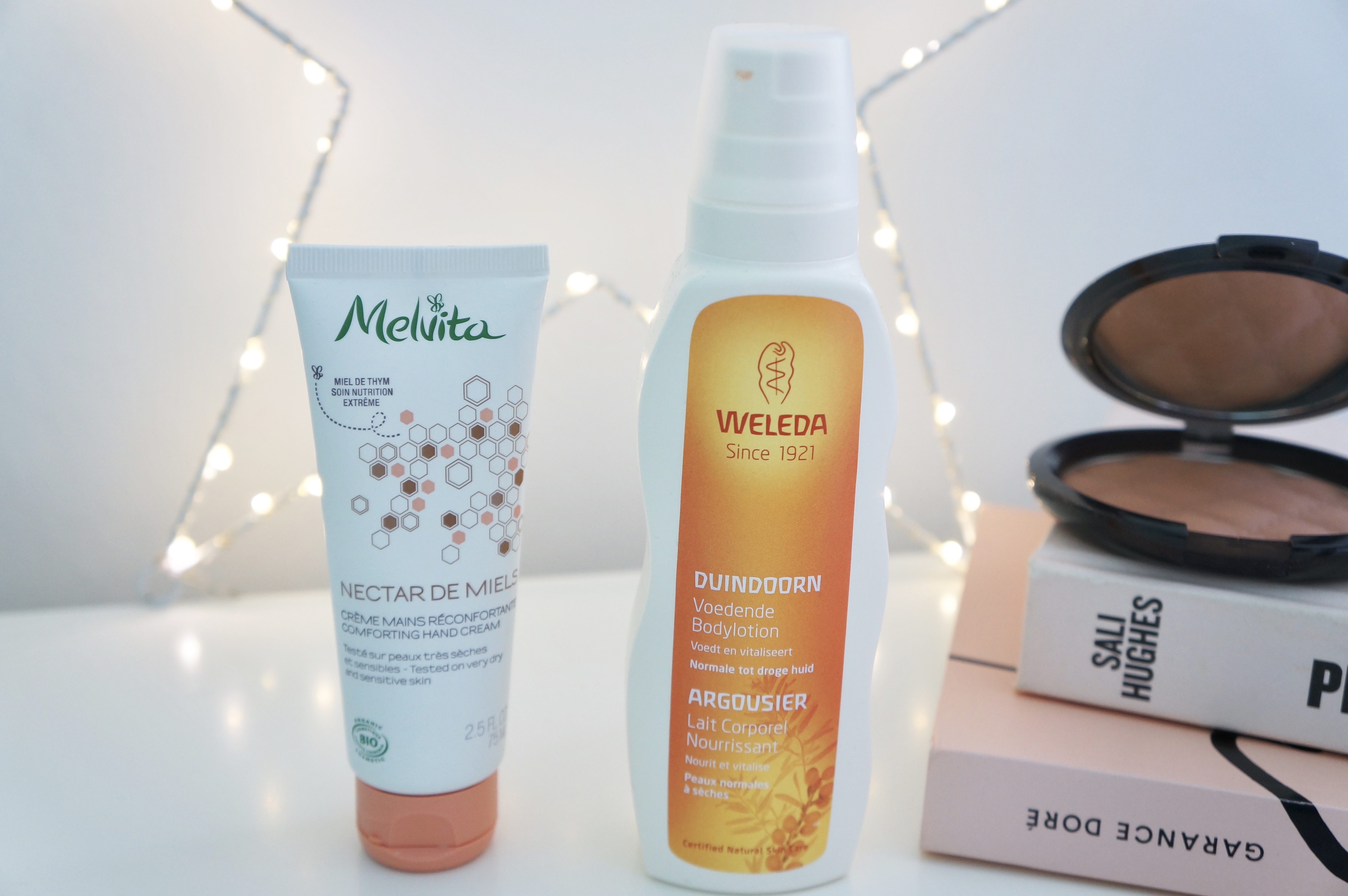 La Crème Mains Réconfortante Nectar de Miels de chez Melvita est nourrissante (grâce au beurre de karité), réparatrice (miel de thym), hydratante, sent délicieusement bon mais sans être trop persistante et ne laisse pas de sensation de gras. On peut donc continuer sa journée tranquille après l’application et les mains sont directement soulagées. Elle me suit un peu partout: soit dans le sac, sur la table du salon, la table de chevet, migre chez la mozer quand je suis distraite aussi… J’aime le format qui est à l’image de la crème: pas imposant, utile et agréable.