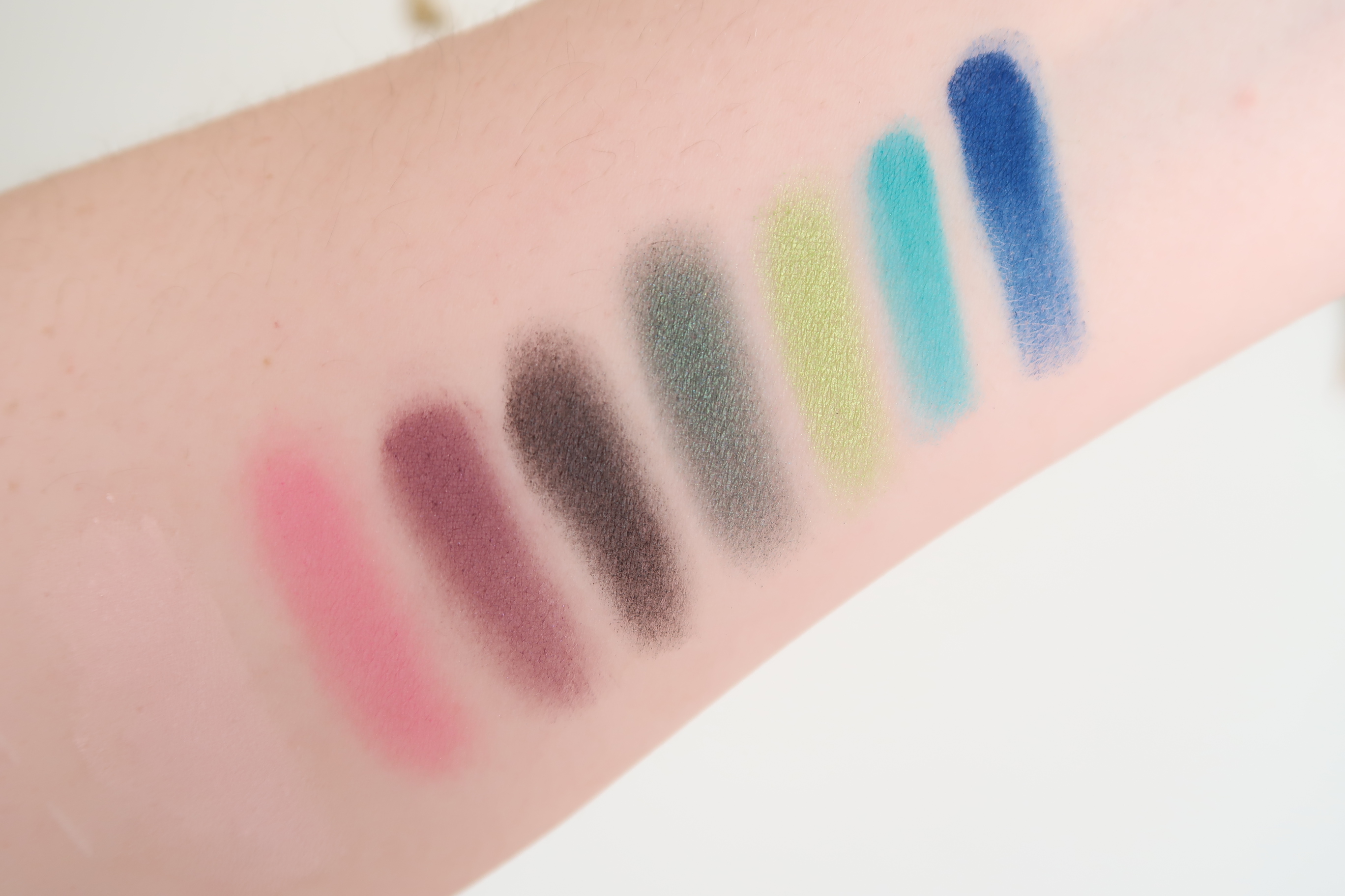 La palette Tenant, c’est un tout autre monde. Ce sont les couleurs vives et brutes où même une couleur de transition n’a pas sa place! On ne minaude pas chez Urban Decay, ça n’a que très rarement été le cas d’ailleurs. D’un côté, on a 3 roses qui sont séparés de 3 belles déclinaisons de vert via un noir-gris irisé et le tout se termine avec un magnifique bleu profond mat. Comme pour la Gold Griot, la Tenant est un beau mélange de mats et d’irisés mais ici, on est clairement dans le make-up dit « éditorial ». Cela dit, dosés savamment, on peut faire des choses colorées tout en restant portables. Mais je pense sincèrement qu’elle est là pour celles qui en ont marre du « portable ». Ici c’est la fête à la vie et à la joie, à la musique et à la décadence. Elle est parfaite pour un maquillage de fêtes, propose les couleurs idéales pour la Gay Pride ou un bold look (look osé quoi… Désolée, déformation professionnelle de la prof d’anglais issé!) de festival. Dans une palette comme dans l’autre, on voit très peu la couleur la plus claire sur mes swatches, c’est normal, cette partie de mon bras est aussi une des plus pâles de tout mon corps. Mais swatcher sur mon dos, tu l’auras compris, j’ai un peu de mal!