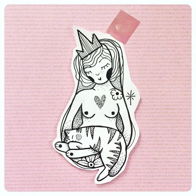 Ce que j’aime beaucoup chez elle, c’est qu’elle amène énormément de féminité dans un monde où les dessins sont encore très masculins. Là où on peut voir (attention, je préviens, je suis baignée de stéréotypes, je sais!) un loup, elle amène un gang de chats qui rappelle celui des mangas des 80’s, là où on est encore marqués par l’histoire du sapin mort, elle vient ponctuer son Instagram avec des fleurs, des papillons et des bateaux qui font fondre de par leur touche d’innocence enfantine, là où on voit un motard avec une pin-up dégoulinante de silicone sur le bras, elle dépose des sirènes, des méduses, des poupées russes et des sachets de thé.