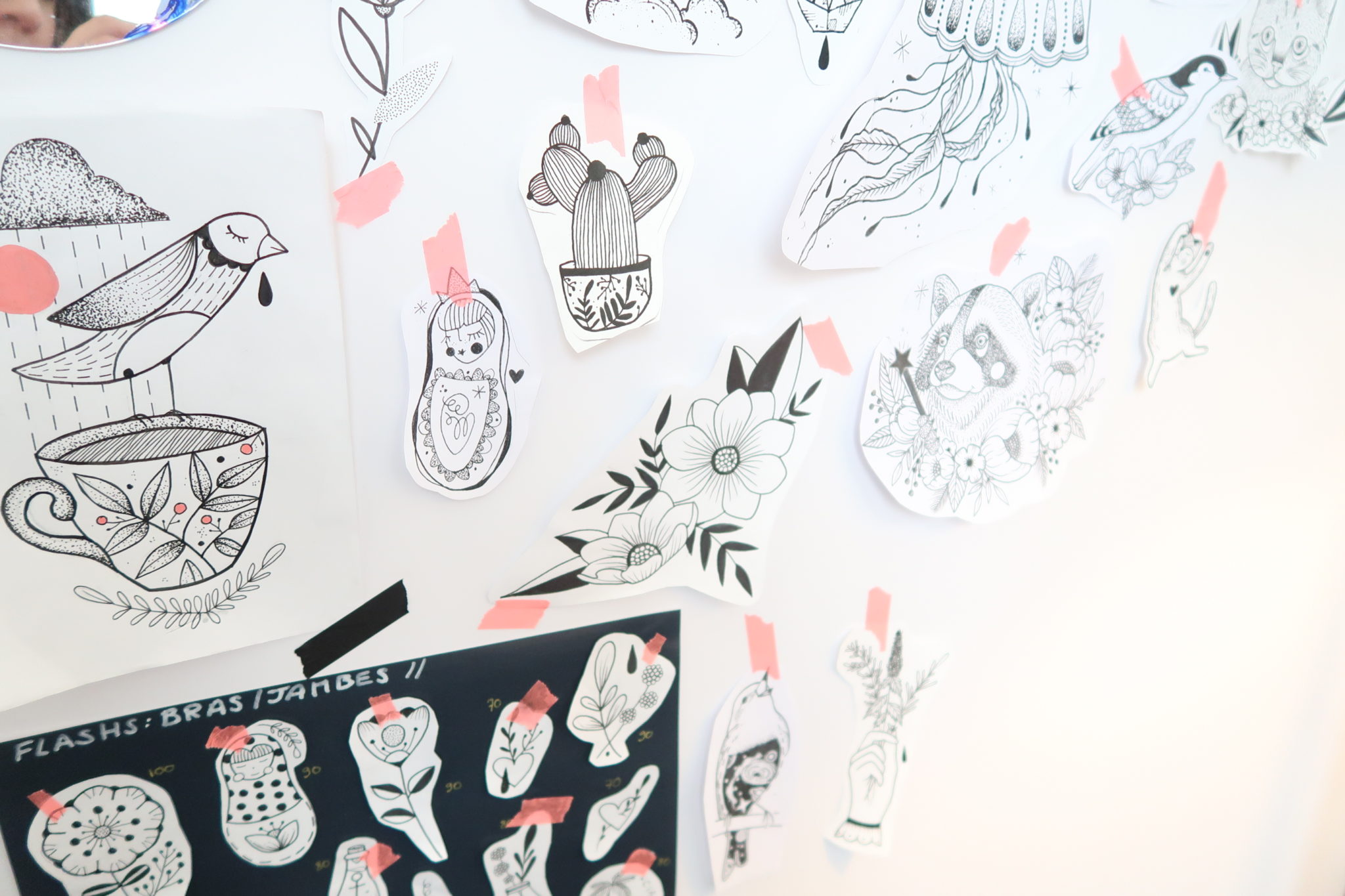 La première prise de contact est un peu anarchique. Je ne suis pas une habituée des studios de tattoos, j’arrive la gorge nouée parce que ce décès (cf. l’évènement marquant oui…) a le poids d’une enclume sur tout mon corps et je m’exprime mal parce que je ne connais pas les termes du tatouage (ne dites pas « des dessins légers et fins » si les traits ne sont pas légers et fins, vous vous ferez mal comprendre, comme moi ^^). Je laisse passer un peu de temps et décide de recontacter Lia en lui expliquant un peu mieux ma situation. On se revoit et là, la magie prend. Comme quoi, quand un projet est en tête depuis si longtemps, que les astres, aussi malheureux soient-ils s’alignent, des fois, il faut persévérer!