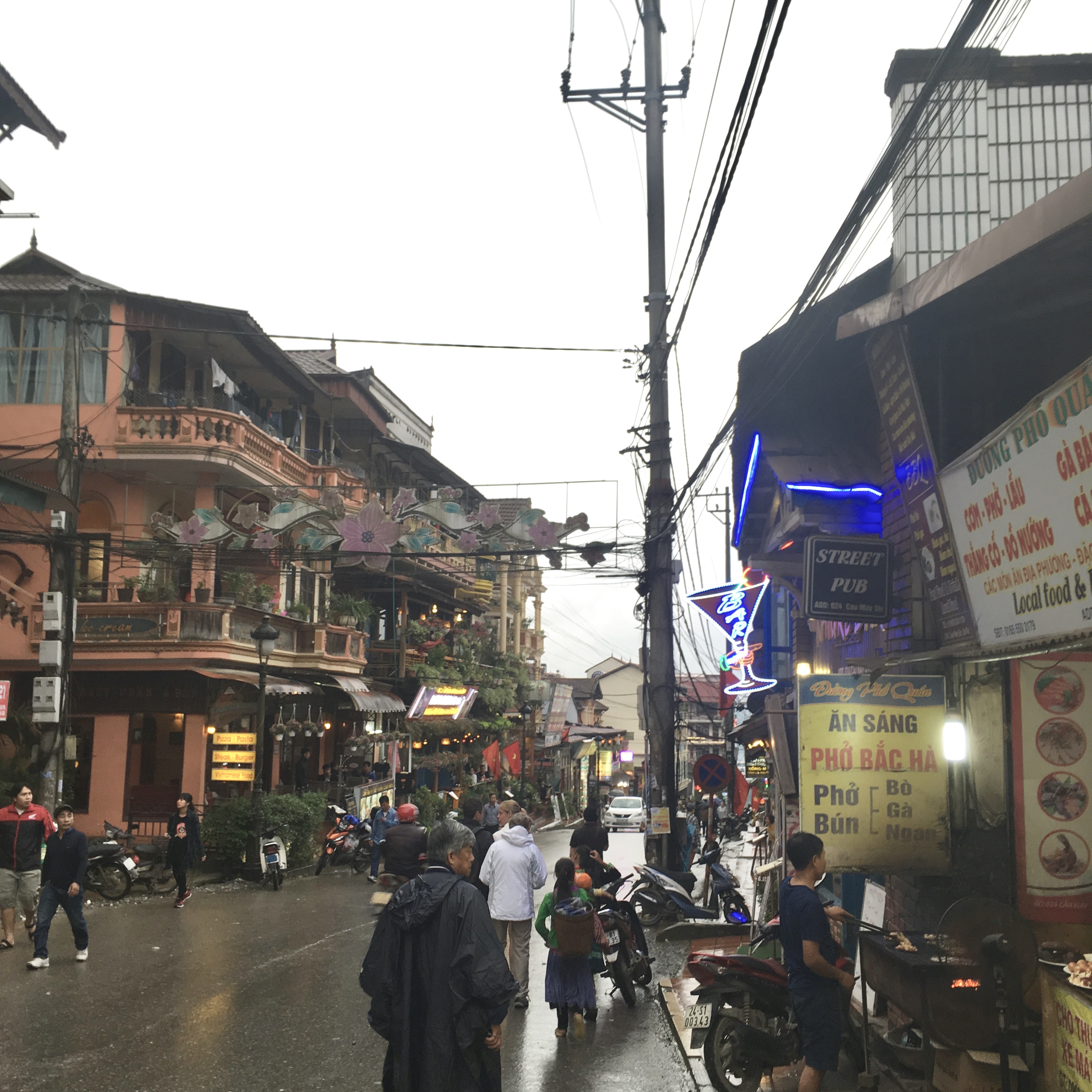 Sa Pa (là encore, de ce que j’en ai vu, l’orthographe varie entre la version divisée ou entière: Sapa…) est tout à côté de Lao Cai, elle-même tout à côté (littéralement) de la frontière chinoise. La ville est à 1500m d’altitude, ce qui permet en effet de reprendre un peu son souffle. Comme l’a dit un de mes cousins, le centre ressemble un peu à une vieille station de ski. C’est assez drôle. Mais alors que j’ai essayé de vous filmer les endroits les plus beaux, il faut savoir que Sa Pa est en réalité une vraie petite ville-chantier. Des tas de sables, de cailloux, des ferrailles, des poutres en fer, des immeubles en construction éventrés, … Si on ajoute à ça les nids de poule qui vont jusqu’à du 2m sur 3 de longueur, dans lesquels la pluie aime s’écouler… Et les voitures s’y vautrer à toute vitesse alors que vous marchez sur le trottoir tout à côté… Bref, vive la boue,… Il vaut mieux prévoir des pantalons en suffisance afin de se changer.