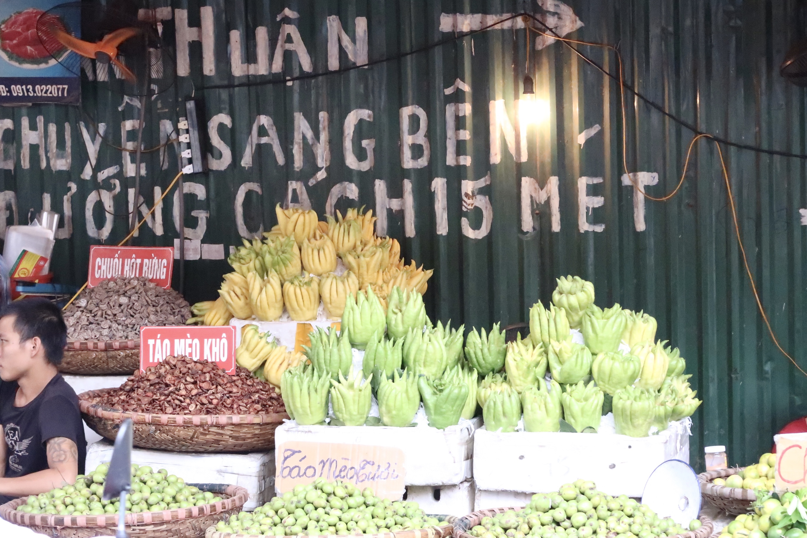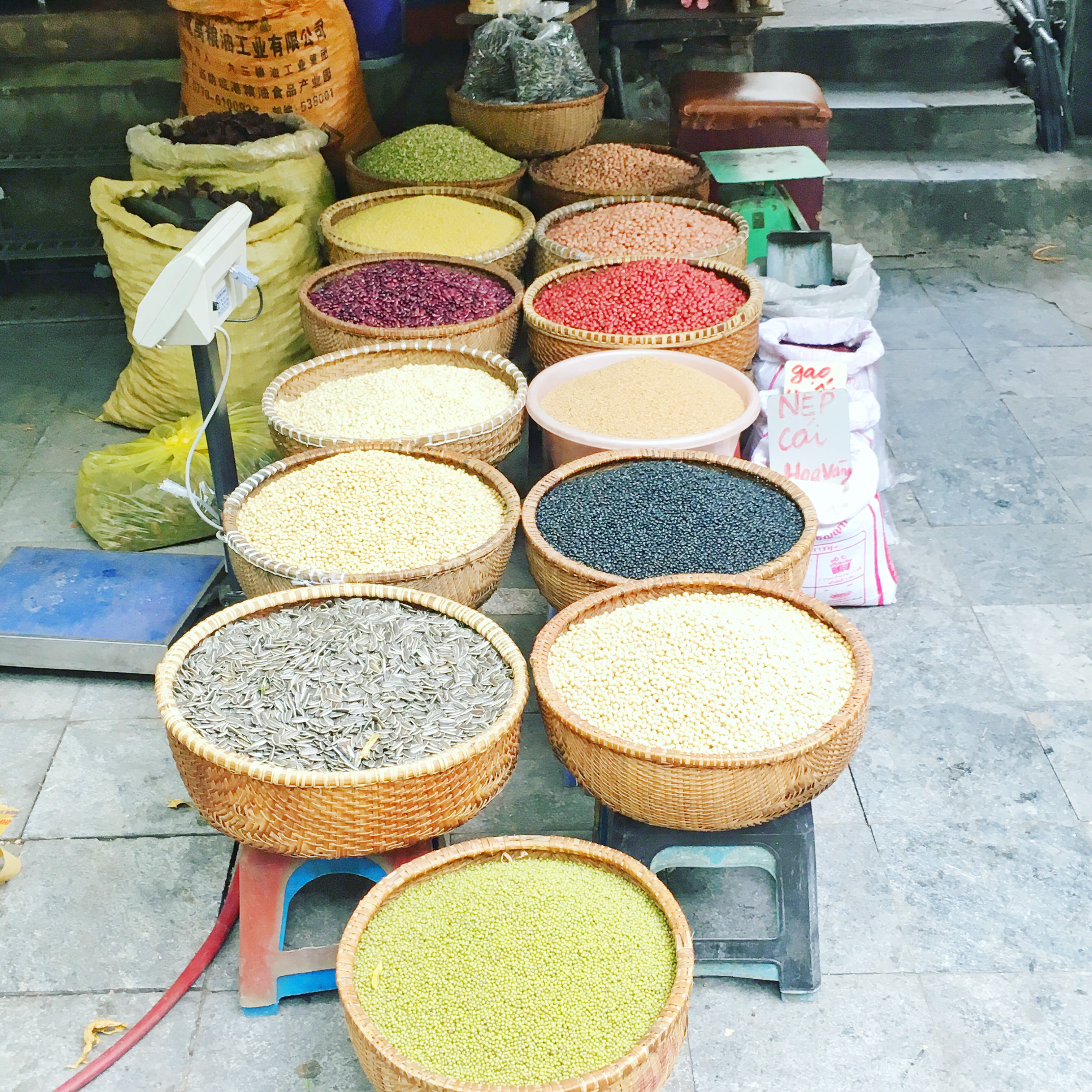 Après un saut au marché nocturne dans le vieux quartier d’Hanoï (beaucoup de bruit, beaucoup de « Made in China », beaucoup de fringues inutiles et de stands beaucoup trop semblables… Pour les liégeois, imaginez le pire de la Batte tout le temps…), nous avons pu découvrir le fameux marché de Dong Xuan (au croisement des rues Dong Xuan et Hang Chieu) . L’intérieur ne m’a pas du tout transcendée: ce sont en fait les fournisseurs des stands tels que ceux sur le marché nocturne. Des slashs à n’en plus finir, des attrapes-touristes (baguettes peu solides, selfies sticks à gogo, vareuses de foot and so on…), j’ai par contre adoré les abords ainsi que l’extérieur. C’est là qu’on y trouve une multitude d’épices, de préparations vietnamiennes (crevettes, poissons ou viandes séchées), de fruits et légumes comme on n’en voit pas par chez nous. Là, enfin, les couleurs et les odeurs charmaient. J’ai juste trouvé un peu dommage que nous y restions si peu de temps après avoir tant traîné à l’intérieur (si j’avais su qu’on allait tomber sur ça, j’aurais devancé le groupe en fait).