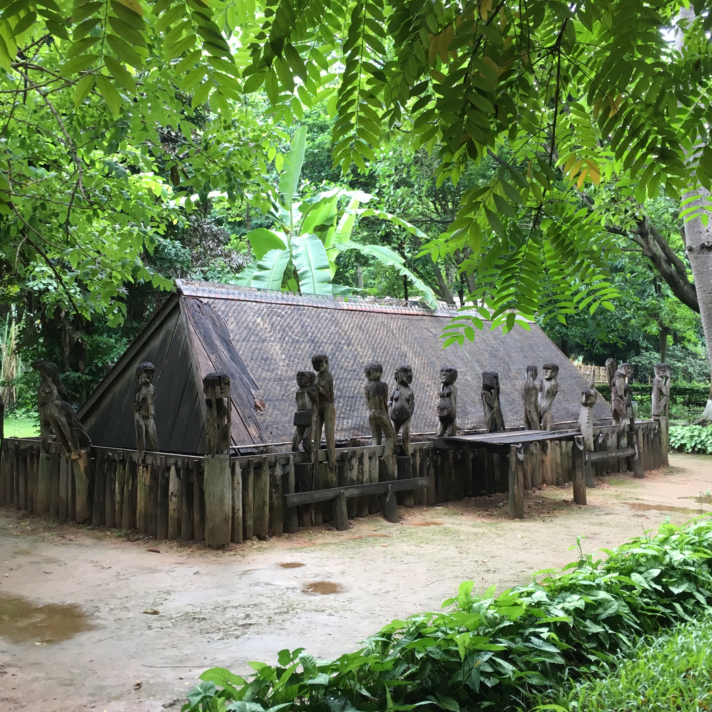On a fini par le musée d’ethnographie ( Nguyễn Văn Huyên, Nghĩa Đô, Cầu Giấy, Hà Nội, Vietnam). J’étais un peu perplexe à l’idée de m’enfermer dans un musée mais ça a au final été très intéressant (et si vous avez de la chance, l’air conditionné ne sera pas en panne!). Le musée est principalement centré sur l’histoire des 54 ethnies vietnamiennes et est très bien conçu afin que les enfants comme les adultes s’y plaisent. Un espace animé de jeux typiquement vietnamiens est d’ailleurs proposé où tout le monde peut s’y essayer (à la base, c’est fait pour les enfants mais les adultes sont vite intrigués eux aussi). Les explications sont en plusieurs langues (dont le français) et le tout est illustré avec une superbe collection de costumes ethniques, objets du quotidien et images de fêtes typiques. Même si ça reste encore un peu flou, j’y ai trouvé énormément de réponses quant aux différentes ethnies, leurs mouvements géographiques, leur culture, etc. A côté du musée d’ethnographie (il fait en fait 3 hectares), j’ai pu aller en vitesse parcourir le musée de l’Asie du Sud Est où là encore, on peut rester en admiration devant de splendides costumes typiques de mariages, de deuils ou autres cérémonies. Finalement, et j’ai trouvé l’initiative vraiment très belle: la partie extérieure est aussi un musée. En effet, en collaboration avec plusieurs ethnies, ils ont reconstruit des maisons typiques de chaque région du Vietnam en grandeur nature. L’intérieur a aussi été aménagé. J’ai adoré voir les différences architecturales selon les besoins de chaque ethnies (la possibilité d’ouvrir le toit pour que la tisseuse puisse continuer son ouvrage par exemple) ou les conditions météorologiques de chaque région (pilotis ou non, etc.). On peut aussi assez vite se laisser impressionner par l’ingéniosité des paysans vietnamiens (les techniques utilisées pour consolider, la prise en compte de l’environnement ou de l’organisation de l’ethnie, etc.).