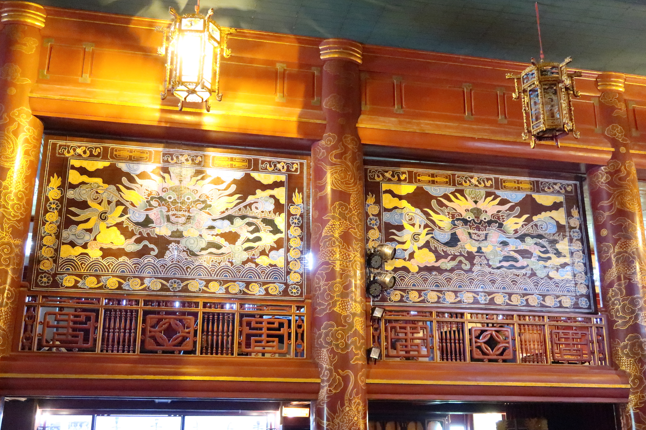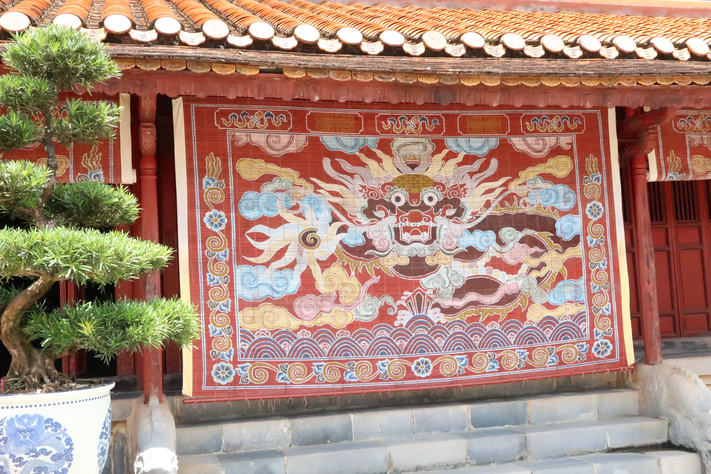 Nous avons donc visité la Cité Impériale où il a fait une chaleur de fifou! Peu d’endroits pour s’abriter du soleil: prévoyez de quoi vous protéger! La Cité vaut amplement la peine car on y entre comme on entre dans un château du Moyen-Age superbement bien conservé. C’est un peu les jardins d’Alhambra du Vietnam: un superbe vestige d’un temps révolu qui reste très bien entretenu (cela dit, les jardins d’Alhambra sont plus impressionnants quand même…). Il est intéressant de se balader dans le temple de la Mère de l’Empereur, de la Grand-Mère, de voir les tailles selon les places à la cour, forcément, la place que les femmes y occupaient, le magnifique théâtre royal, une des dernières résidences de Bao Dai (dernier empereur avant le communisme), toutes les portes, les jardins, quelques objets du quotidien et malheureusement aussi, les dégâts des guerres subies par le Vietnam (beaucoup de bâtiments ont été complètement détruits). On y est au calme, exit les bruits des travaux et des mobylettes, ça fait plaisir…