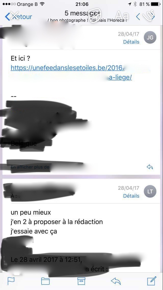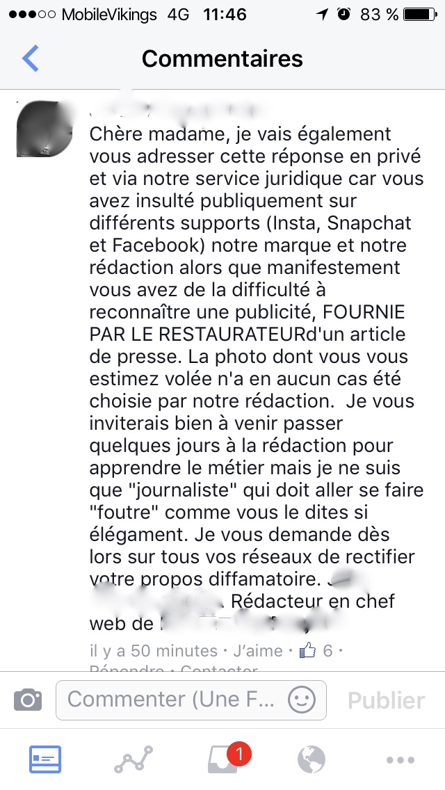 Suite à plusieurs échanges ENFIN avec le rédacteur en chef, et sur les conseils de mon avocat, je leur envoie donc à mon tour une mise en demeure où je leur demande (non pas de l’argent que j’aurais été totalement en droit de demander d’ailleurs) mais un Erratum dans le numéro suivant où ils mentionneront d’où vient la photo et des excuses… Que je n’ai évidemment jamais eues. De la part de personne. Je suppose qu’ils le lisent bien et s’énervent encore plus puisque la restauratrice me contacte complètement angoissée, me supplie d’arrêter de m’énerver parce que ça lui fait de la mauvaise pub (dis fifille, t’as payé et t’as été flouée, tu es aussi en droit de râler envers eux mais ne viens pas me demander de la fermer quand on vole mon contenu!), me dit qu’ils lui ont téléphoné pour s’excuser envers elle et qu’ils font pression pour que j’arrête de m’énerver. Ils se sont donc excusés en privé auprès de la restauratrice qu’ils ne se sont pas gênés d’accuser publiquement mais auprès de la personne qui a été volée, JAMAIS. Par dessus tout, ils font pression sur elle en lui disant que c’est totalement de sa faute si ma photo s’est retrouvée là sans mention. WHAT?!!?