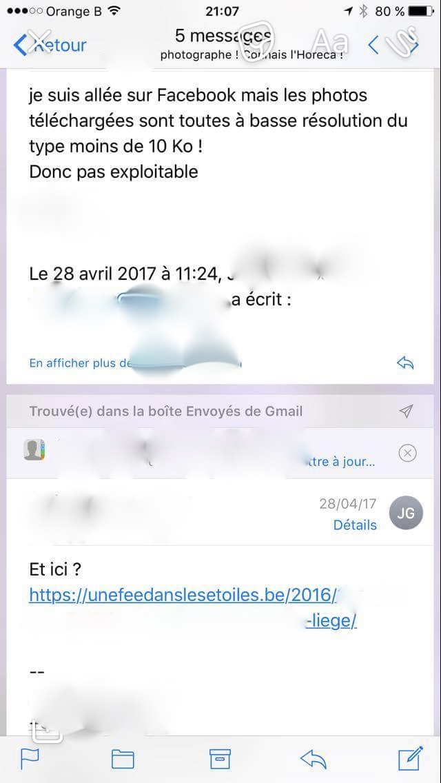 Avant d’expliquer ma situation, il y a quelques petites choses à savoir: tout ce qui est publié sur un blog est protégé par les droits d’auteur (photo ou contenu écrit, tout.); je changerai les noms des personnes et du médium concerné pour me protéger d’un procès pour diffamations et flouterai ou effacerai les noms des personnes sur les printscreens (c’est le monde à l’envers oui…); toutes les infos que j’ai eues concernant la loi m’ont été fournies par un avocat spécialisé en droit d’auteurs (ce qui veut dire que tout ce que j’affirmerai ici, je ne l’ai pas sucé de mon pouce); je n’estime pas être une photographe de génie mais quand je me tue à la tâche pour acheter un appareil photo (avec mes économies, je ne gagne pas ma vie avec mon blog…), que je me déplace sur mon temps libre pour aller faire des photos et qu’une personne qui est payée pour faire ça pense qu’elle peut se servir chez moi, je n’apprécie pas; lorsqu’un médium publie un contenu, il en est responsable et doit absolument s’assurer de vérifier toutes les sources qui lui auraient éventuellement été fournies (se défendre en disant: « c’est pas moi c’est l’autre qui m’a donné la photo! » c’est donc raté).